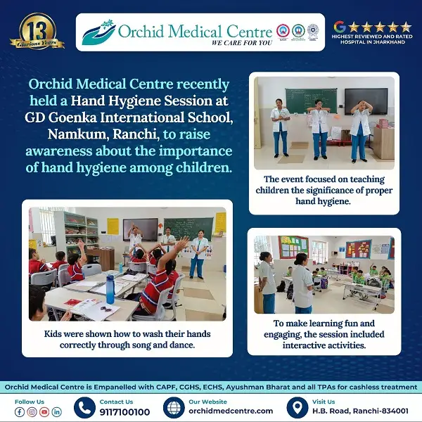 Orchid Medical Centre recently held a Hand Hygiene Session at GD Goenka International School, Namkum, Ranchi, to raise awareness about the importance of hand hygiene among children. To make learning fun and engaging, the session included interactive activities. Children were taught proper hand hygiene through song and dance as well as how to wash their hands correctly.