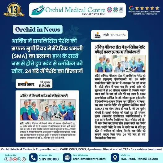 आर्किड मेडिकल सेंटर में डायलिसिस पेशेंट श्री लावी राम की सफल सुपीरियर मेसेंटेरिक धमनी (SMA) का सफल इलाज डॉ मुनेश्वर कुमार (कंसल्टेंट इंटरवेंटिनल कार्डियोलॉजिस्ट) ने अपने कैथलैब टीम के साथ यह सफल इलाज मुमकिन हुआ। हाथ के रास्ते नस से होते हुए स्टंट से ब्लॉकेज को खोल, 24 घंटे में पेशेंट का डिस्चार्जभी कर दिया गया।